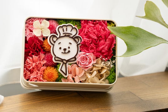 水やりの手間がかからず、枯れない花として人気のプリザーブドフラワーを一輪ずつ、缶いっぱいにアレンジ。バラやカーネーション、アジサイなどを使い、インテリアとして長く楽しめるデザインに仕上げました。アクリル製のこぐまのカノンのチャーム付き。