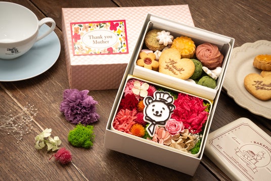大阪の人気パティスリーと神戸の花屋によるコラボレーション。余計なものを使わない手作りクッキー缶と、枯れないプリザーブドフラワーBOXの母の日限定ギフトセット