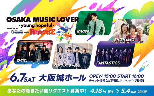 大阪のミュージックステーション・FM802が『番組にリクエストされるアーティストのステージを、リスナーに生で観てもらいたい』との思いから2002年にスタートさせ、毎年大阪城ホールで開催しているライブイベント「REQUESTAGE」。今年は「大阪国際文化芸術プロジェクト OSAKA MUSIC EXPO 2025~大阪城ホール~」の一環として、6月7日(土)に「OSAKA MUSIC LOVER -young hopeful-supported by 紀陽銀行 WITH REQUESTAGE」と題して開催します。今年の出演アーティストは、 imase、SHISHAMO、ねぐせ。、ハンブレッダーズ、FANTASTICSの5組。