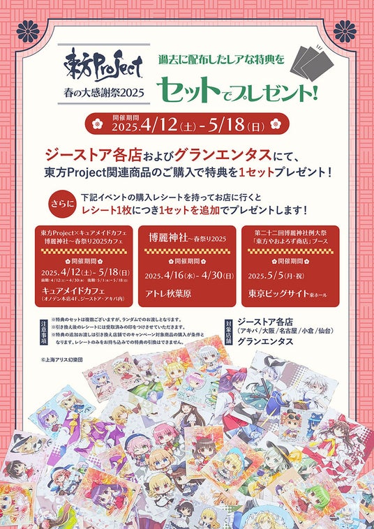 「博麗神社崇敬会(東方やおよろず商店」は、4月19日(土)~5月18日(日)《グランエンタス春祭り2025 with 東方Project》開催を発表した。