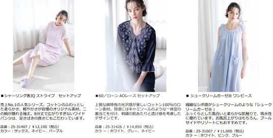 ナルエーオリジナル素材「シュークリームガーゼ(R)」を使用した商品など、涼しげな素材が登場。