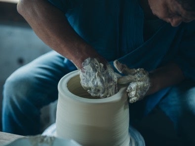 鍋島焼で実際に使用する陶土を用いたろくろ成型が体験できるワークショップ。小さなお子さまから大人まで、どなたでもご参加いただけます。職人技をぜひご体感ください。