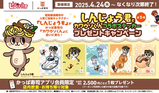 コロワイドグループのかっぱ寿司(カッパ・クリエイト(株) 本社:神奈川県横浜市、代表取締役社長:山角豪)は、高知県須崎市の人気ご当地キャラクター「しんじょう君」とコラボレーションし、2025年4月24日(木)より、かっぱ寿司全店にて公式アプリ会員限定のプレゼントキャンペーンを開催いたします。