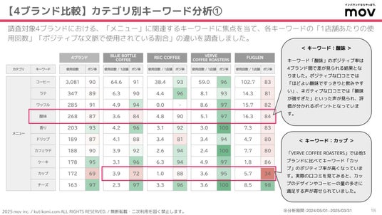 こちらの表では、調査対象4ブランドにおける、「メニュー」に関連するキーワードに焦点を当て、各キーワードの「1店舗あたりの使用回数」「ポジティブな文脈で使用されている割合」の違いを調査しています。