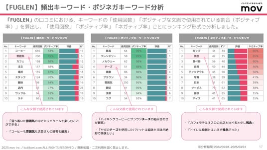 こちらの表では、「FUGLEN」の口コミにおける、キーワードの「使用回数」「ポジティブな文脈で使用されている割合(ポジティブ率)」を算出し、「使用回数」「ポジティブ率」「ネガティブ率」ごとにランキング形式で分析しています。