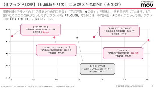 こちらの散布図では、調査対象4ブランドの「1店舗あたりの口コミ数」「平均評価(★の数)」を算出しています。1店舗あたりの口コミ数がもっとも多いブランドは「FUGLEN」で226.3件、平均評価(★の数)がもっとも高いブランドは「REC COFFEE」で★4.44でした。
