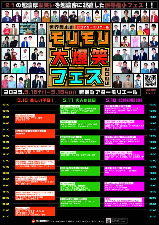 2025年5月16日(金)~5月18日(日)の3日間、新宿シアターモリエールにて、『世界最小のモリモリ大爆笑フェス2025』の開催が決定いたしました。