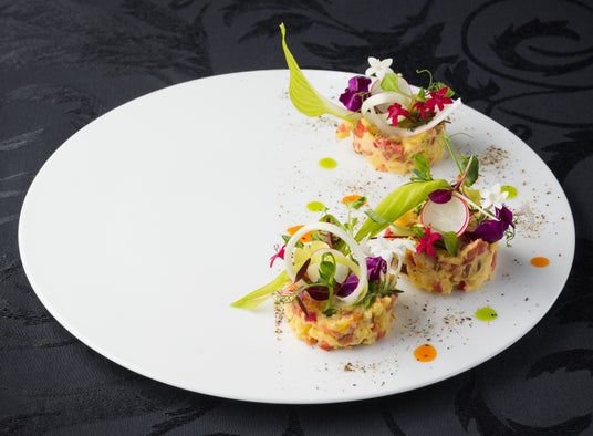 黒熟烏龍茶で燻した“インカのめざめ”に、紅芯大根のいぶりがっことカシューナッツを合わせた香り高い特製ペースト。うるい、ラディッシュなど瑞々しい旬野菜を添え、塩胡桃のアクセントが奥行きを添えます。華やかな彩りと調和のとれた味わいが魅力の一皿です。