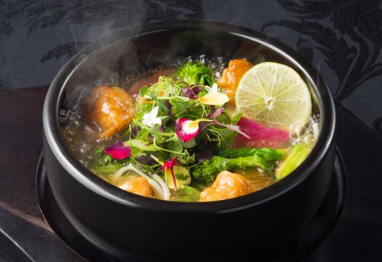 大豆をベースにした精進肉の唐揚げを主役に、春の恵みをふんだんに盛り込んだ、彩り豊かな野菜のフォー。こごみ、筍、菜の花、ビーツ、紅芯大根、きのこ、ネギ、エディブルフラワーなど、旬の食材が織りなす多層的な味わいが魅力です。ライムの爽やかさと燻製塩胡椒の深みが絶妙に調和し、繊細でありながらも余韻の残る一杯に仕上げました。一口ごとに、春の息吹を感じられます。