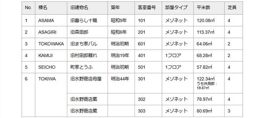 伊勢河崎地域で守り継がれてきた6棟の歴史的建造物を保存・改修し、ホテルの客室として再生しました。 いずれも明治初期から昭和初期に建てられた町家や蔵、商店の母屋で、すべて一棟貸しスタイルで、57平方メートル ~120平方メートル と、広々とした空間をご利用いただけます(※)。1棟につき最大4名までご宿泊いただける客室も複数あり、ご家族やご友人グループでのご滞在にも適しています。メゾネットタイプから平屋造りの邸宅まで、各建物の建築様式やストーリーもさまざま。旅の目的や過ごし方にあわせて、お好みの一棟をお選びください。