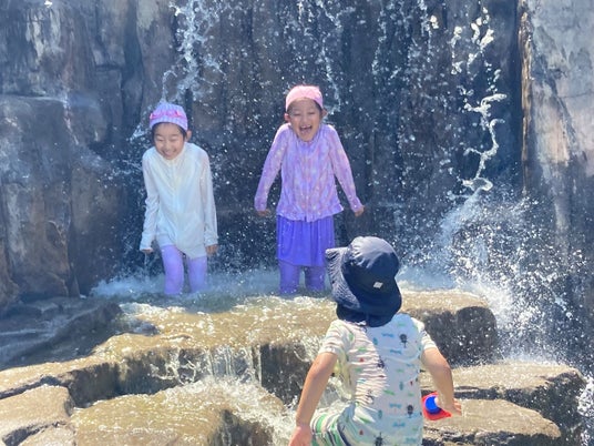 山梨県笛吹川フルーツ公園にあるウォーターアスレチックにチャレンジします。笛吹川で遊んでいるかのような、流れる水の上に設置された遊具を使って思い切り体を動かします。