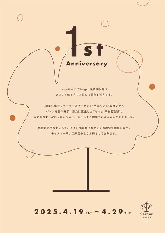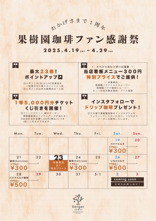 Verger 果樹園珈琲がオープン1周年を記念し、特典満載の『ファン感謝祭』イベントを4月19日から開催!
