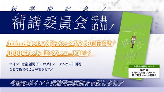 早速、2025年4月~5月 藤代先生ver.が配信開始しています。画像は1枚1000ポイントで交換可能、カレンダーの対象期間で交換可能となります。