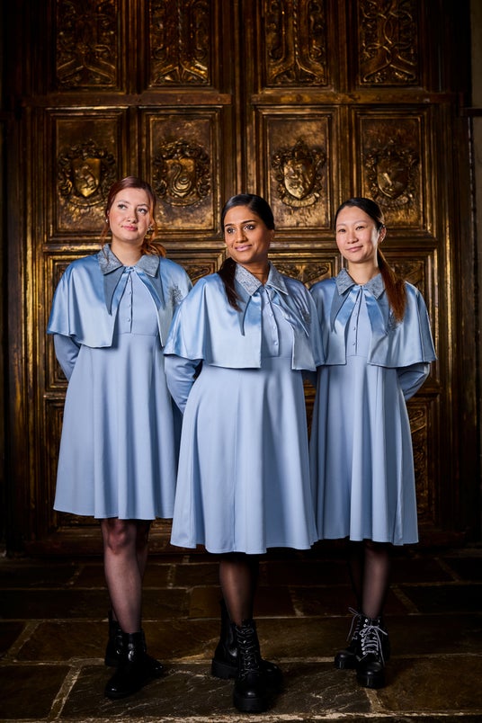 さわやかなブルーのボーバトン魔法学校の制服は、さらっと着られる素材のワンピースに軽やかな素材のケープがセットになっています。レイヤードになっている襟はツイード素材で、同系色ながらも異素材の組み合わせが高級感を演出。まるでフラーたちが大広間に登場したときのような魅惑と気品を漂わせる1着。ケープとワンピースの両方の胸元にはボーバトンの校章がほどこされています。