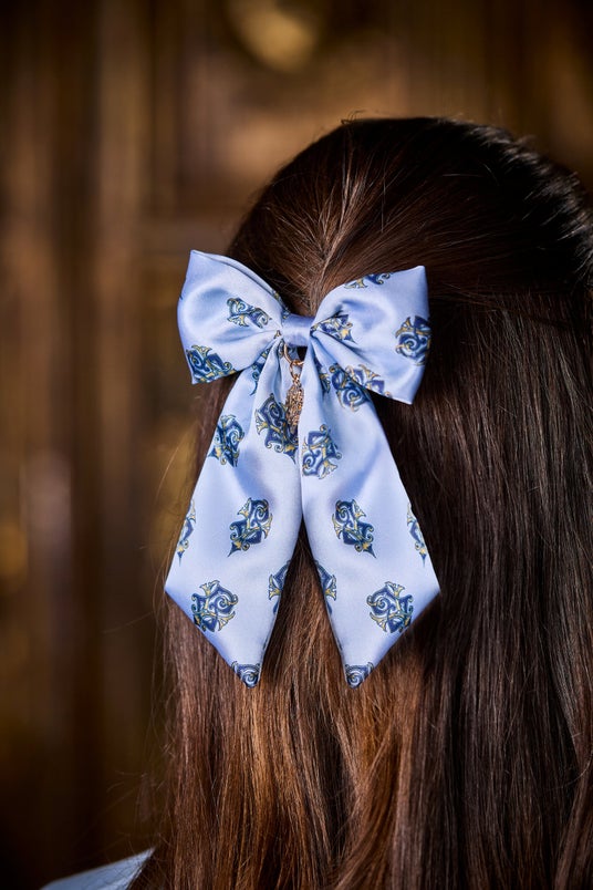 さらっとした素材のヘアボウにはボーバトンの校章がプリントされています。クリップ式なので髪飾りとしてはもちろん、カバンや洋服につけることも可能。