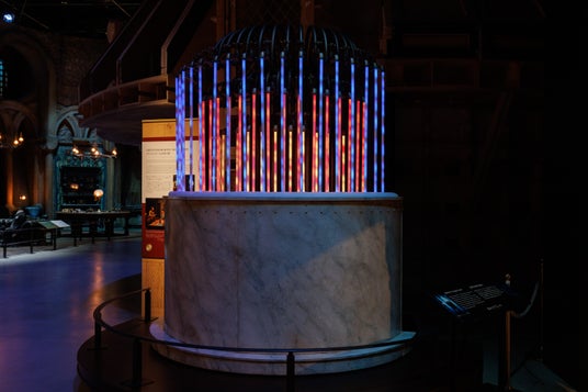 映画「ハリー・ポッター」シリーズのなかで最も古く、最も大きなセットである大広間に足を踏み入れると、その中央に、青い炎が揺らめくゴブレットが出現。伝説の試合、三大魔法学校対抗試合の出場者を選ぶ役割にふさわしく、歴史の重みと威厳を漂わせます。炎が青から赤に変わると、選手の名前が書かれた紙片が宙を舞い、まるで映画のシーンそのままの臨場感溢れる瞬間が目の前に広がります。さらに、ゴブレットの周囲には、ダンブルドアが設置した年齢線がしっかりと引かれ、17歳未満の生徒が名前を投じられないようにした、あの印象的な場面も忠実に再現されています。