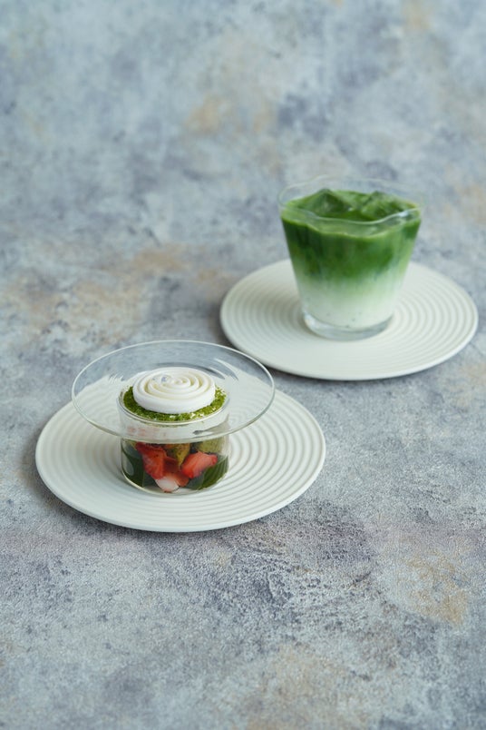 深い味わいの玉露ラテとともに、季節限定の庭園パフェをお楽しみいただけるセット。