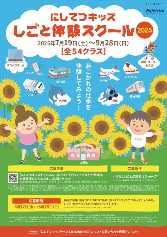西鉄グループでは、2025年7月19日(土)から9月28日(日)までの期間中、当社グループの多種多様な仕事をお子さまに体験していただけるプログラム「にしてつキッズしごと体験スクール2025」を開催いたします。