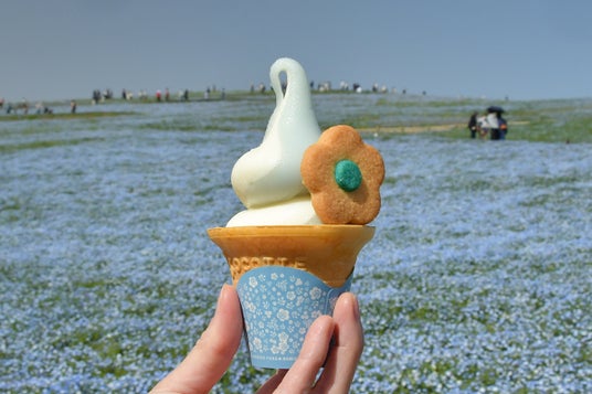 ネモフィラとあわせておすすめしたいのが、春のネモフィラグルメ。大好評の「ネモフィラブルーソフト」や「児玉冷菓のババヘラアイス「ネモフィラ」」に加え、今年はお花をイメージした形で、朝露のように煌めくシュガーをトッピングした「おはなソフト」が登場します。他にもネモフィラブルーソフトとレモネードのさわやかな組み合わせが魅力の「ネモフィラブルーフロート」など、写真映えする美味しいスイーツが盛りだくさんです。