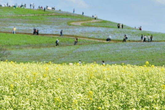 ナノハナとのコラボレーションみはらしの里では今年は新たに、ナノハナ「クリームホワイト」が登場。一般的な黄色いナノハナとはひと味違う、上品でやわらかな色合いです。また、ネモフィラとナノハナとのコラボレーションも美しく、青と黄色のコントラストが映える春の風景が一面に広がります。