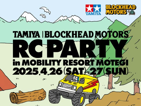 アウトドアとRCが融合した屋外イベント「TAMIYA BLOCKHEAD MOTORS RC PARTY」を開催いたします。「RC×アウトドア」をテーマに掲げ、タミヤとブロックヘッドモータースがアウトドアでの RCの魅力と楽しみ方を提案するイベントです。自分のRCカーやレンタルRC(有料)でも楽しめる「特設アスレチックRCサーキット」や「RCカーフリー走行ゾーン」「RC WALK」などを開催。またTAMIYA × BLOCKHEAD MOTORSの会場限定アイテムの販売も行われます。