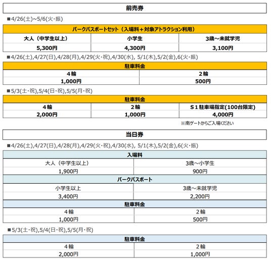 ゴールデンウィーク期間は、施設入場料と1DAYパークパスポートがセットになった「パークパスポートセット」と「駐車券」の前売券を販売しています。詳細は、公式ホームページよりご確認ください。