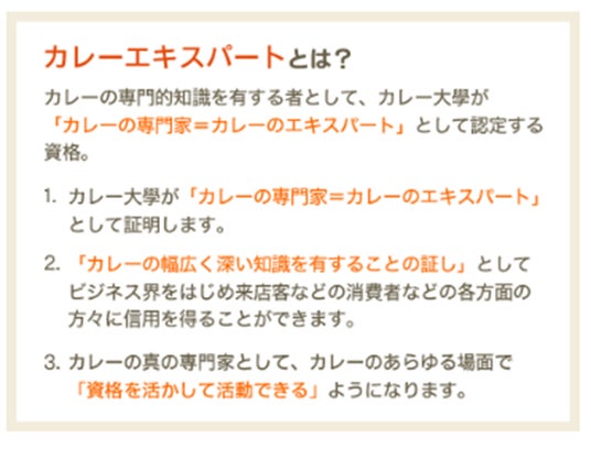 特 典: カレーエキスパートの資格が取得できます。
