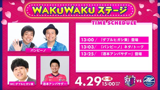 セレッソ大阪では2025シーズンも土日祝の試合を中心に、スタジアム場外でもWAKUWAKUを感じていただけるように「WAKUWAKUステージ」を開催いたします。メインMCにダブルヒガシ 東さんをお呼びしゲストとしてバンビーノのお二人、酒本憲幸アンバサダーが出演しスタジアム場外を更に盛り上げていただきます。