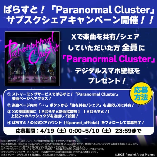 株式会社ClaN Entertainment(本社:東京都港区、代表取締役社長:大井 基行、以下ClaN)は、リアルとバーチャルでパラレルに活動するVTuberプロジェクト「ぱらすと!」初のリアルライブ「ぱらすと! ONE MAN LIVE「襲鳴祭」のチケット一般販売、ZAQ提供「Paranormal Cluster」のカラオケ配信情報、シェアキャンペーンなどの最新情報をお知らせします。
