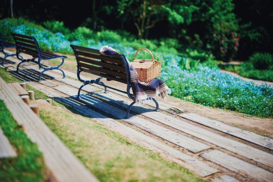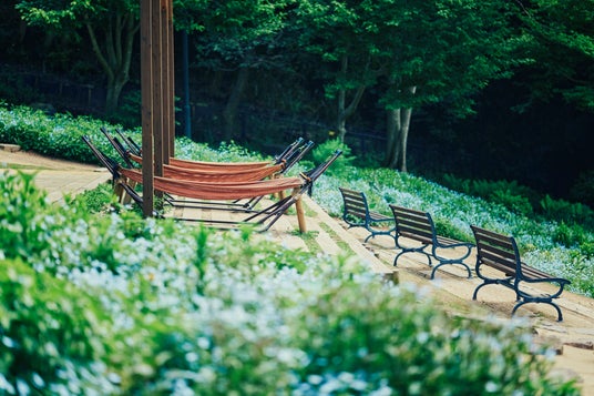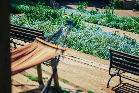 ネモフィラ畑のハンモックとベンチ
