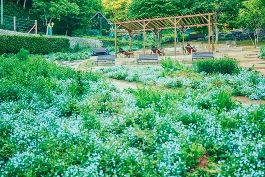 12のテーマをもつガーデンのうちのひとつ「四季の庭 -いやしの庭-」。美しい新緑、心地よい鳥のさえずり、爽やかに吹き抜ける風、まさに癒しのガーデンで間もなくネモフィラが見ごろを迎えます。青一色に染まる爽やかな風景の中、優雅にひと休みしませんか