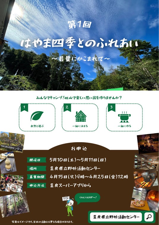 1泊2日のキャンプイベント。 郷土奈良の自然を感じながら楽しいひとときをお過ごし頂けます。~第1回はやま四季とのふれあい~