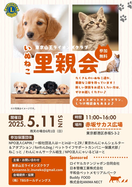 イベント名: 赤坂サカスいぬねこ里親会日時: 2025年5月11日(日) 11:00~16:00(雨天順延:6月1日(日))