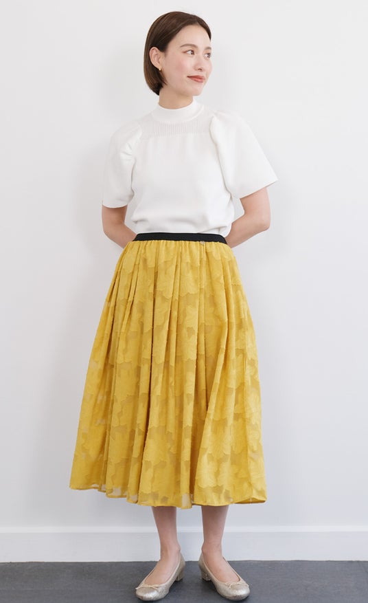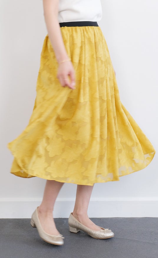 ここだけ、今だけ!トレンドのシアー素材やトレコードで人気の花モチーフで春夏に映えるイエローカラーのスカート。
