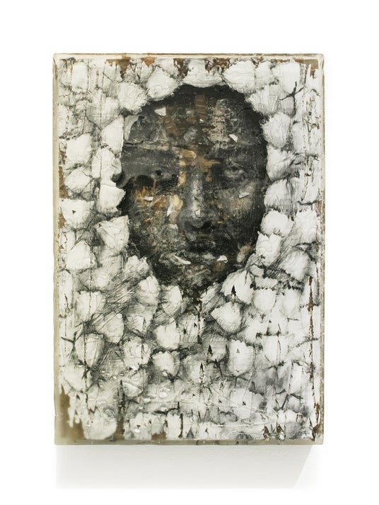 今回開催される個展「死と再生のイニシエーション」では、積層ダンボールに絵を完成させ、ナイフで絵を傷つけ、半立体に再構築、樹脂で硬化、という4工程で、誕生、死、再生、永遠を表現したシリーズ作品「RISIN 死と再生」を展示販売いたします。