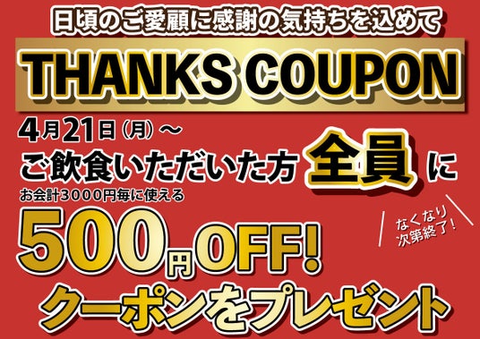 サンクスクーポンはなくなり次第終了!お会計3000円毎に利用できるお得なクーポン!