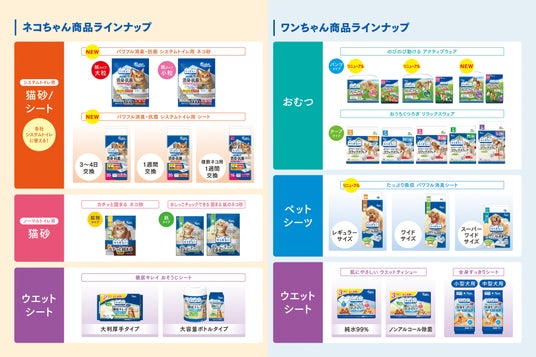 「エリエールPet キミおもい」は、ペットとオーナーさんの“より幸せな暮らし”をカタチにするため、“ペットへのやさしさ”と“多様化するペットオーナーさんのニーズ”を重視した5カテゴリー(システムトイレ用猫砂・シート、ノーマルトイレ用猫砂、おむつ、ペットシーツ、ウエットシート)の商品を展開。
