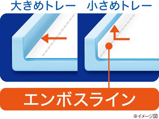 ・折り曲げやすいエンボスラインを新採用して、小さめトレーにもぴったりフィット。サイズが異なる各社のトレーに使用でき、シートのズレや浮きによるモレを防ぎます。