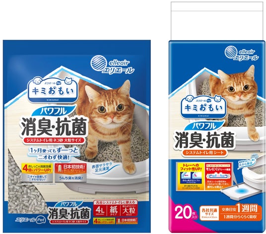 このようなお悩みに応えるため、「エリエールPet キミおもい」は2025年4月21日(月)から、日本初の技術※5を採用し、消臭効果4倍と1カ月継続する消臭力を実現した『キミおもい パワフル消臭・抗菌 システムトイレ用ネコ砂』を新発売。また、ネコちゃん特有のトイレ臭を元から除去する消臭成分を配合し、各社システムトイレで使える『キミおもい パワフル消臭・抗菌 システムトイレ用シート』を同時に発売しました。