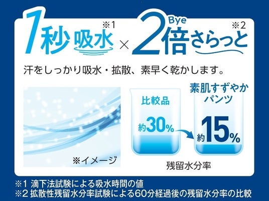 今年は「1秒吸水(※1)×2倍さらっと(※2)」をキャッチコピーに、DRY機能がさらに進化しました。パンツの生地が1秒で汗を素早く吸水・拡散します。また、洗濯して60分後の水分残留率が、当社従来のデニムパンツが約30%に対して、素肌すずやかパンツは約15%と半分の残留率で、2倍さらっと乾きやすく快適です。