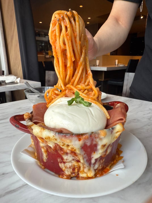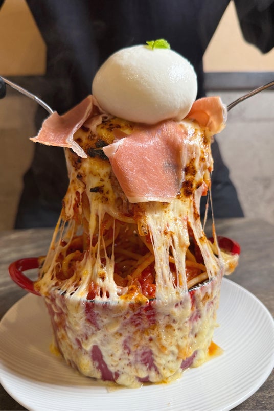 これは窯焼きミートパスタに高級ブラータチーズを丸ごと1個贅沢にトッピングしたインパクトある一品!