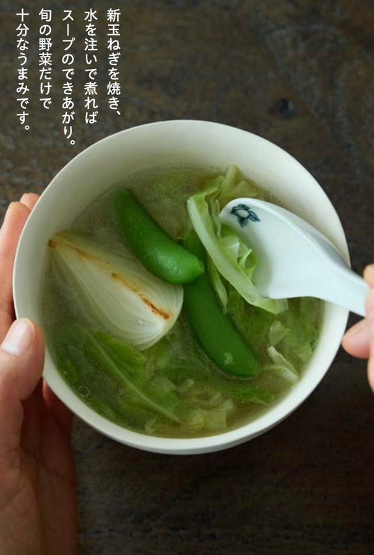 2 旬野菜で簡単スープ:新玉ねぎやトマトなど、素材自身の水分と旨味を活かした、だしいらずのスープ作り。