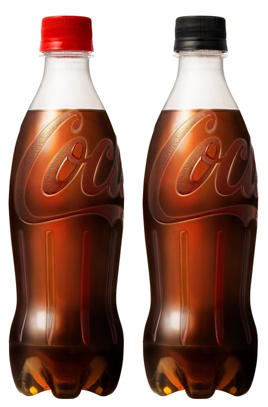 左から「コカ・コーラ ラベルレスボトル」500mlPET、「コカ・コーラ ゼロ ラベルレスボトル」500mlPET