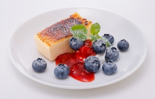 上品な甘さとキャラメリゼの苦みがくせになるカタラーナに、いちごのソースとブルーベリーを添えました。