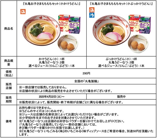 株式会社丸亀製麺(本社:東京都渋谷区、代表取締役社長:山口 寛)が展開する、食の感動体験を追求し、手づくり・できたてにこだわる讃岐うどん専門店「丸亀製麺」は、2025年4月22日(火)より『丸亀お子さまもちもちセット(小かけうどん)』を全国の丸亀製麺にて販売開始いたします。
