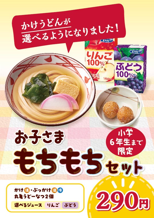 販売開始3ヵ月で120万食突破! 『丸亀お子さまもちもちセット』お客さまの声にお応えして新たに『かけうどん』も選べるように! 打ち立ての“うどん”と“丸亀うどーなつ”“ジュース”がセットで290円