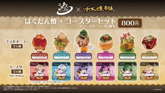 各メンバーをモチーフにしたばくだん焼メニューが登場いたします。味や使用する材料などもメンバーが考案し、それぞれの個性や世界観を味覚で表現したメニューとなっており、さらに、メンバーが考案したネーミングにも注目が集まっております。暇72は情熱的な赤をテーマにした「赤くて美味い奴。」を、雨乃こさめは“ネギ”嫌いをあえて使い「こさめの分もネギ食べて?」を展開。いるまのメニューは、まるでラップバトルのようなテンションで名付けられた「TORITERITAMA a.k.aばくだん焼」、さらに、LANは普段のSNS投稿スタイルを詰め込んだ「わふ うがさいきょ う!めしそばくだん焼」、すちは普段の配信の話し方で脳内再生されそうな「ジェノベーゼになりたいばくだん焼」、そしてみことは王子感あふれるネーミング「王子のとろーり贅沢たこザーニャ」。いずれも、味・見た目・ネーミングに至るまで、メンバーそれぞれの“らしさ”を凝縮したメニューばかりで、まさにシクフォニの世界観に浸りながら食を楽しめる至高のコラボ企画となっています。