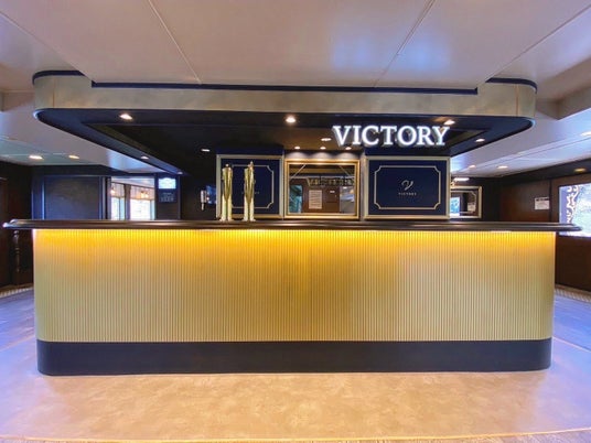 海賊船「ビクトリー」は18世紀に活躍したイギリスの戦艦「ビクトリー」をモデルシップに、2007年に建造しています。「イギリスの伝統と文化を感じる豪華クルーズ」をコンセプトに、様々なタイプの座席を新設するなど、お客さま一人ひとりが心地よい豊かな船旅をお楽しみいただけるよう特別船室のインテリアを刷新しています。さらに、船内カフェはバーカウンターをイメージしたシックで落ち着きのある空間へ生まれ変わりました。