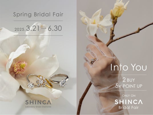 株式会社 今与(本社:京都市中京区、代表取締役社長:今西信隆)が製造・販売する、ラボグロウンダイヤモンドジュエリーブランド「SHINCA(シンカ)」は、3月21日(金)から6月30日(月)まで、国内直営店(SHINCA 銀座、IMAYO 京都御池店)とIMAYO 公式オンラインブティックにて「Spring Bridal Fair 2025」& SHINCAブライダルフェア限定の新たなリワードプログラム「Into You」キャンペーンを好評同時開催中です。