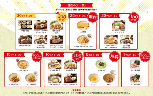 やよい軒の人気定食メニューの絵柄がシャッフルされ、定食の絵柄が揃うと「当たり!」となります。最大5個のスタンプ獲得でき、コツコツ貯めたい方におすすめです。
